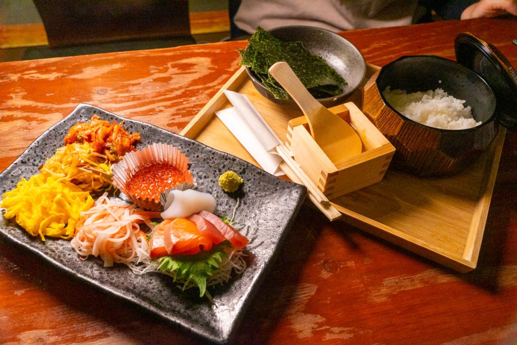 最初にやってきたのがこのセット。まずはこれから!という食べ放題あるあるのやつでして、手巻き寿司ということでご飯と海苔もセット。セルフで巻くやつです〜!