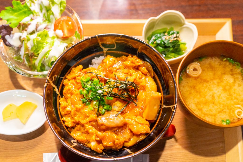 そして出てきた親子丼。サラダや小鉢、味噌汁にお漬物もセットです。