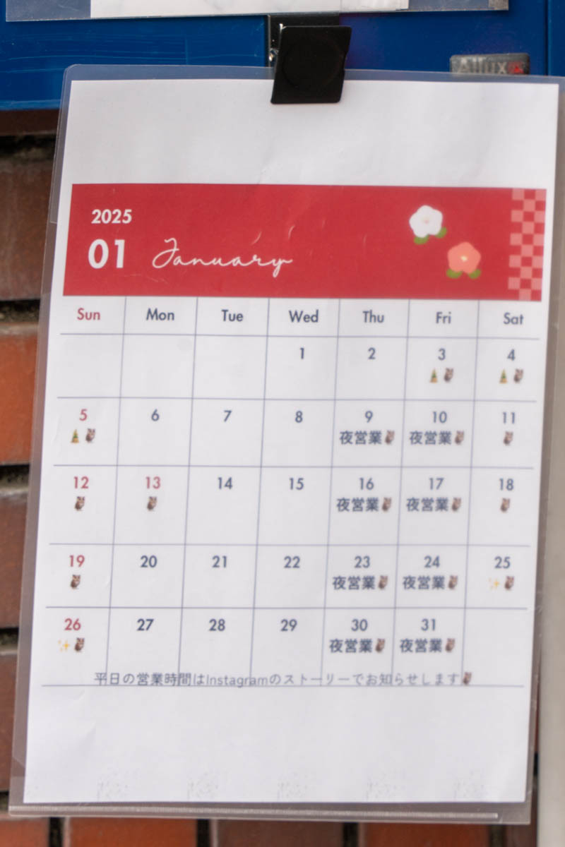 1月の営業日はこんな感じ。平日の営業時間はインスタのストーリーをどうぞ。