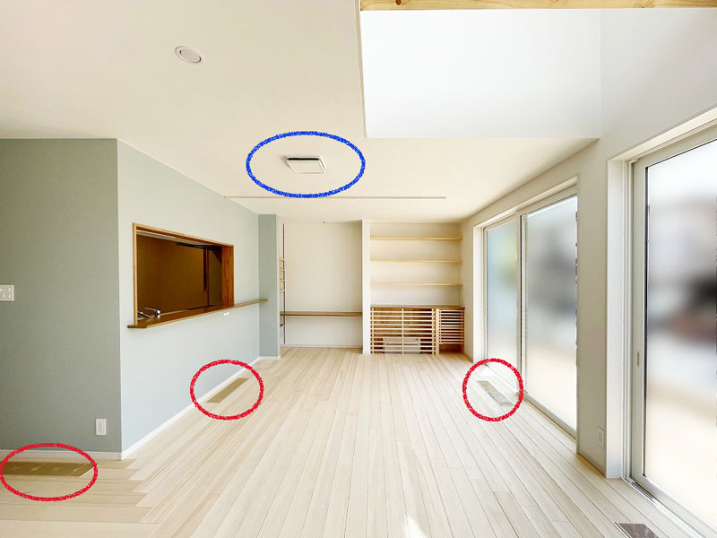 「これは家具などが入る前の写真ですが、青○部分からは冷房室から冷風が、赤○部分からは床下エアコンから温風がほんわり吹き出します」