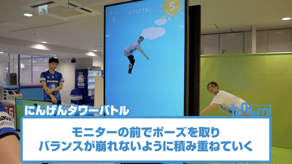 小型のトランポリンで飛び跳ね、画面に写った京阪電車をより早くゴールさせた人が勝利のゲーム。