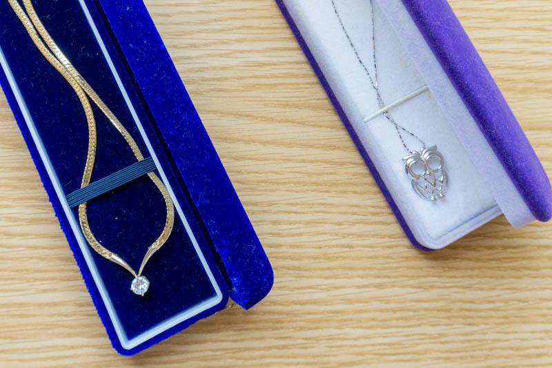 ジルコニアのネックレスが1万9,500円、金のチェーンのネックレスが4万2,000円、箱なしのアクセサリーおまとめで3,000円です。