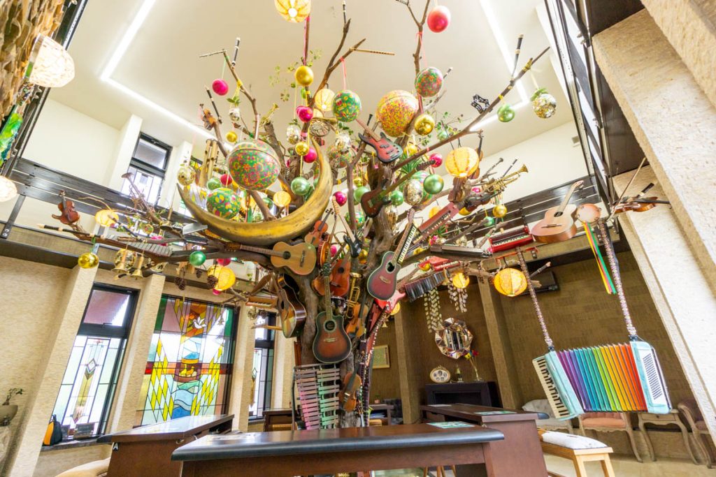 この『楽樹』は廃棄予定だった楽器をアート作品として蘇らせたもので、役目を終えた楽器が木を明るく彩って再生しているイメージがこの空間にピッタリだということで置かせていただきました」