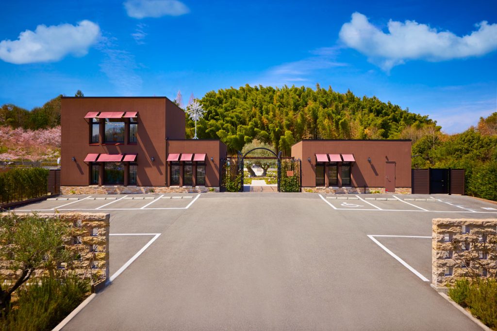奈良や京都との県境にある「京阪奈墓地公園」の敷地内にあり、墓地公園内を奥に進むと千年オリーブの森の専用駐車場が見えてきます。