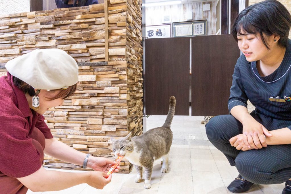 「ネコ好きな方やお子さんがいらしたときは、タイミングがよければおやつあげ体験をしていただいていますよ♪」