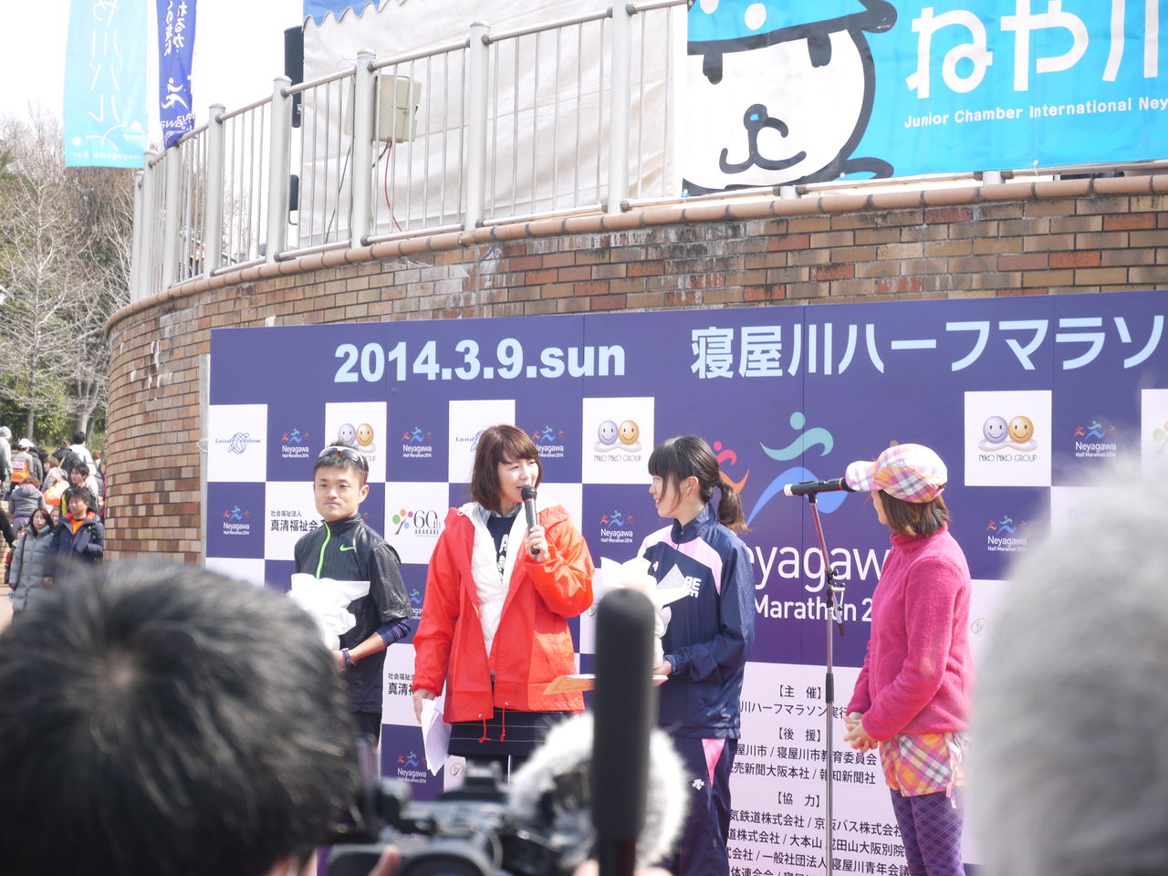 12時ごろ寝屋川公園に到着したら、ちょうど表彰式が実施されていました。ハーフマラソン50歳以上の部で優勝したお二人と、ゲストの千葉真子さん(右端)。