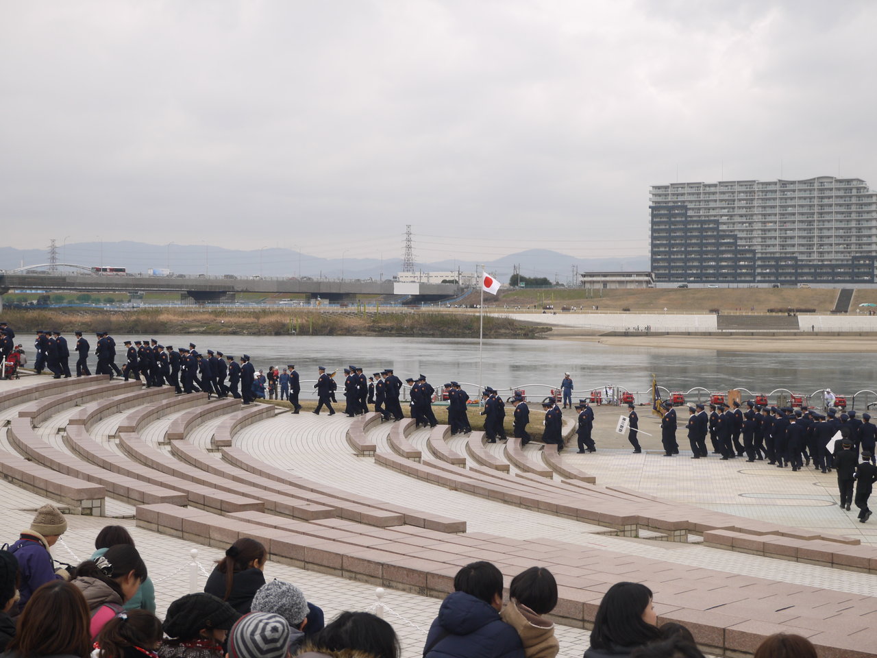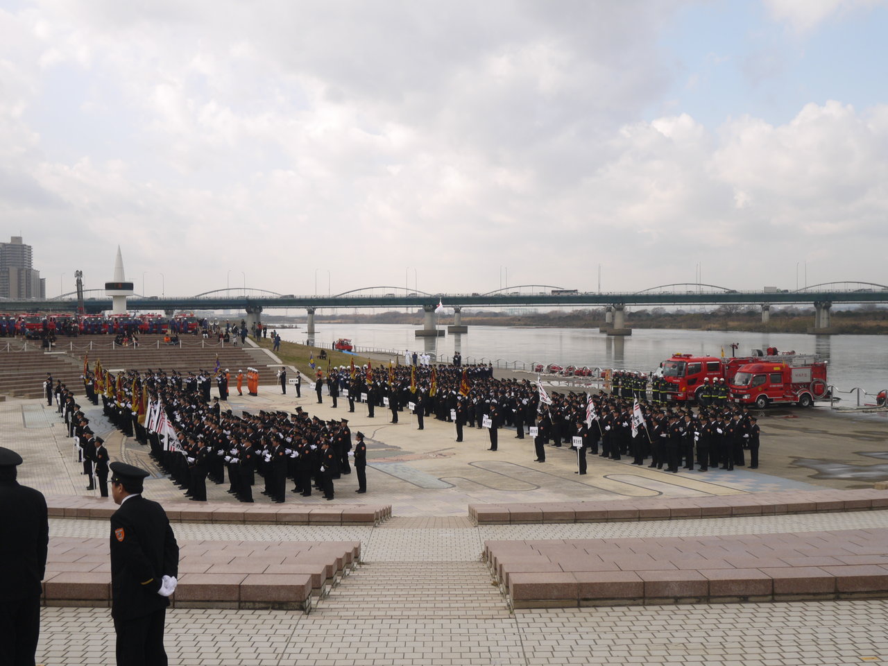 まずは式典から。式典では、アクアシアターという円形広場に、向こう側が枚方の消防団員が、