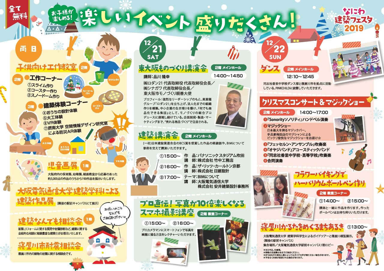 児童画展や子供向け工作教室(スライム作り、おうちの設計体験)、大学との連携イベント(電通大のガイドツアーなど)だけでなく、クリスマスコンサート、ダンスショー(同志社香里中学校、ピンクチャイルド)なども盛りだくさん。