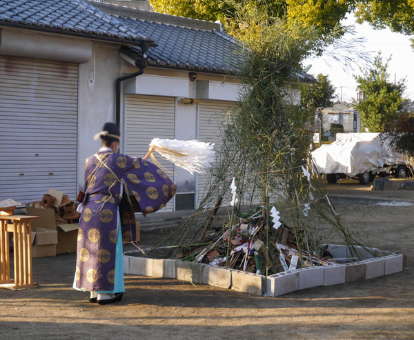 儀式の途中で宮司さんと思しき人が本殿から出てきてとんどや燃やすものを祈祷。