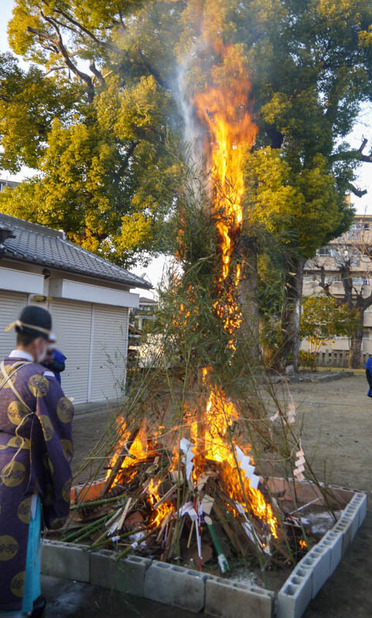 大利神社で行われた「焼納祭」の様子。とんどやお正月のしめ飾りなどが燃やされて炎に