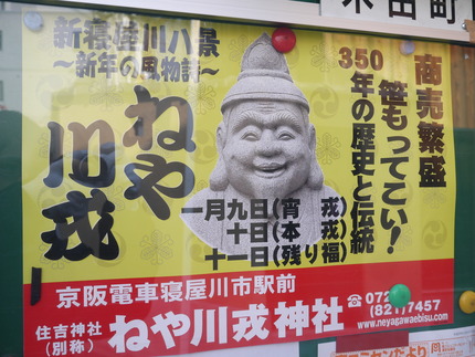 初日の宵戎に当たる9日(火)19時半ごろ寝屋川市駅を降り立つと、ねや川戎の案内が出ていました。