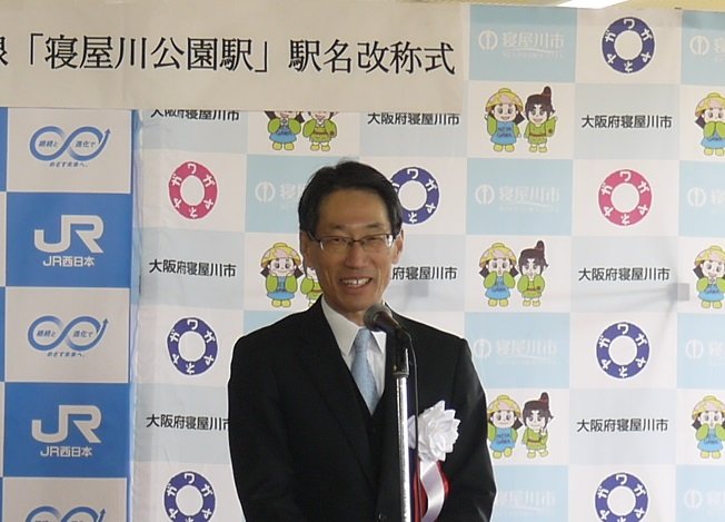 はじめに北川法夫寝屋川市長が出席者に感謝の意を述べるとともに、駅名の改称が地域ブランドの向上や駅周辺で進む町づくりにつなげる狙いがあることをアピール。