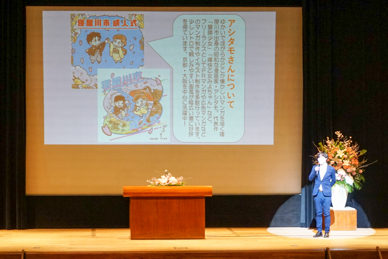 20分ほどの式典の後には、イベントとして寝屋川市出身の漫画家「アシタモ」さんとのコラボ企画が行われました。