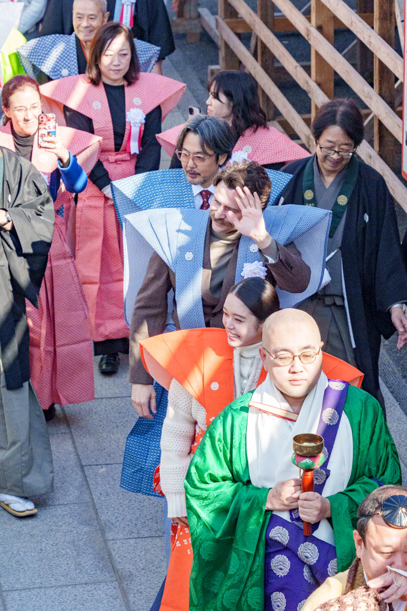 お練り行列を終え本堂でのご祈祷のあと、屋外の特設舞台に朝ドラ俳優さんらが集まりました!左から、髙石あかりさん、トミー・バストウさん、岡部たかしさん。