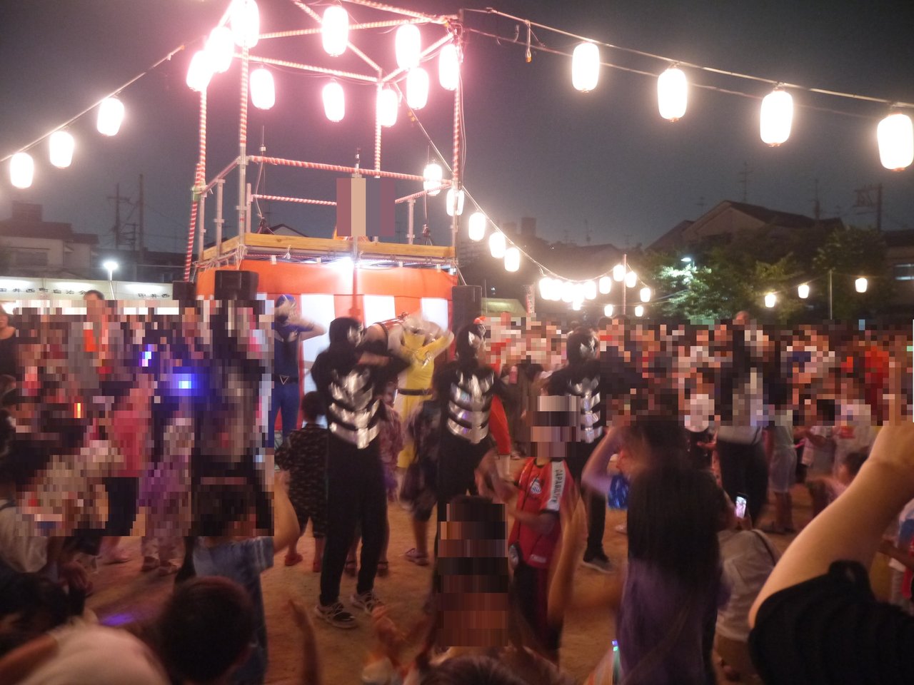 やぐらの周辺では19時30分ごろから「田井西レンジャー」という3年前にできた自治会のヒーロー戦隊が登場し、お祭りを盛り上げました。