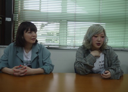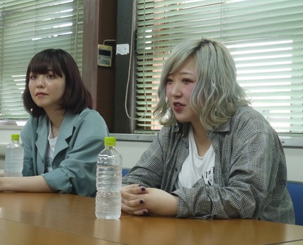 会話によると、バンドメンバーの牛丸ありささん(写真左)とごっきんさん(同右)は寝屋川市内の高校(西寝屋川高校と北かわち皐が丘高校)出身で、卒業してから5年ぐらいになります。