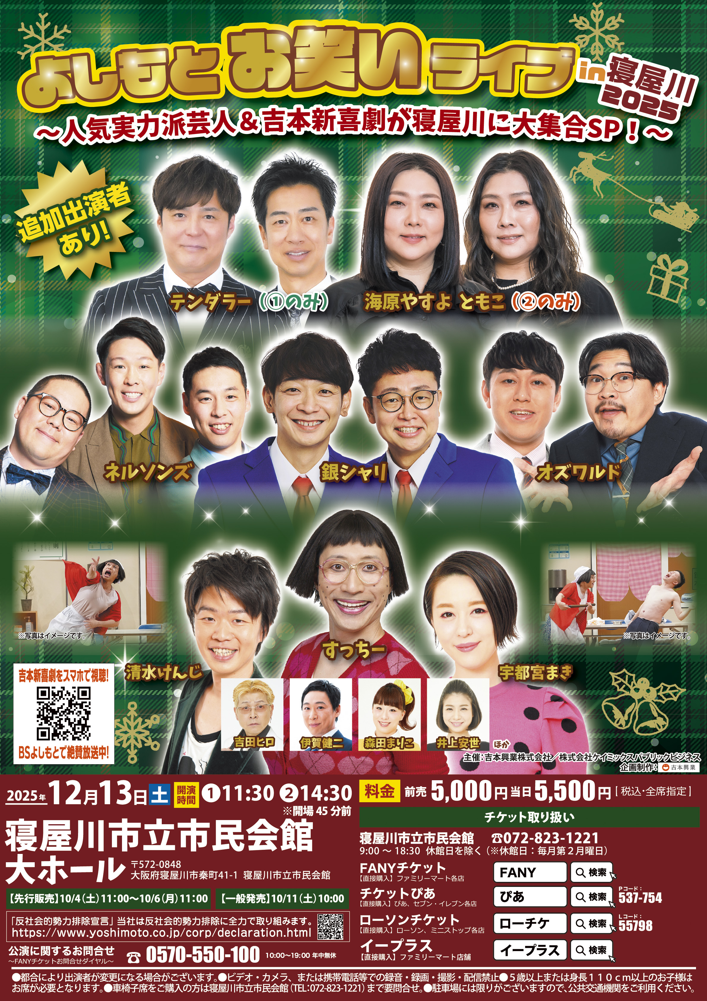 公式サイトによると、12月13日に「よしもとお笑いライブin寝屋川2025」が開催されることがわかります。ライブは11:30〜と14:30〜の2部制です。