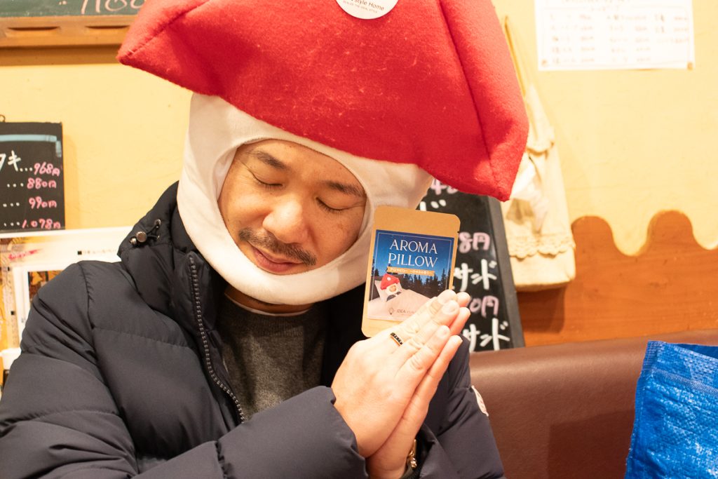 ノベルティのアロマピローとひのきミストを披露してくれる北浦社長