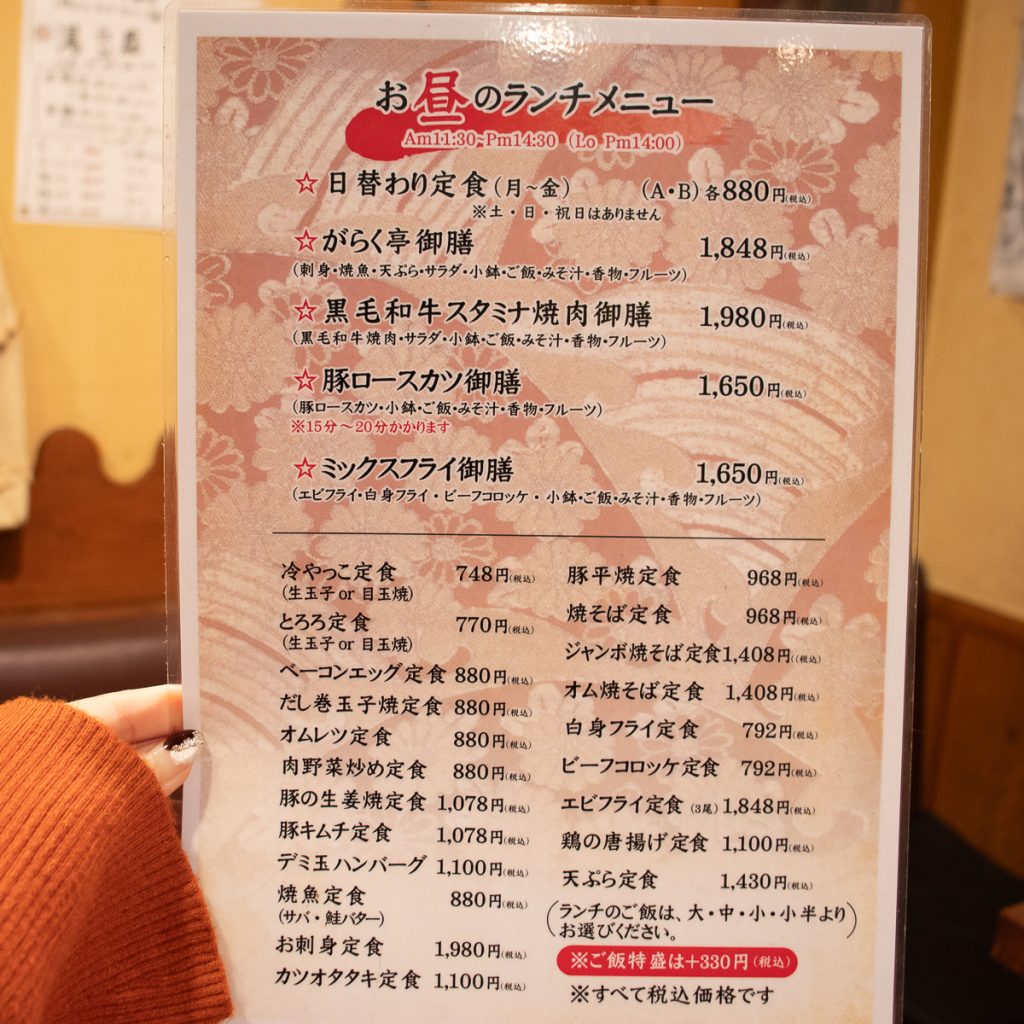 がらく亭は居酒屋ではあるもののランチメニューが充実していて、お昼の時間帯になるとかなり込み合う人気店!
