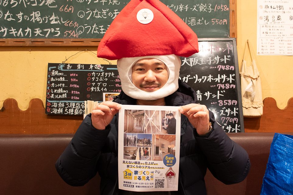 寝屋川市を中心に注文住宅の設計・施工を手がける地域密着型の工務店IDEA style Homeの社長。自らお家型の被り物をかぶり「アイデアマン」というキャラクターで魅力を発信中。