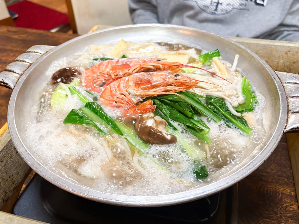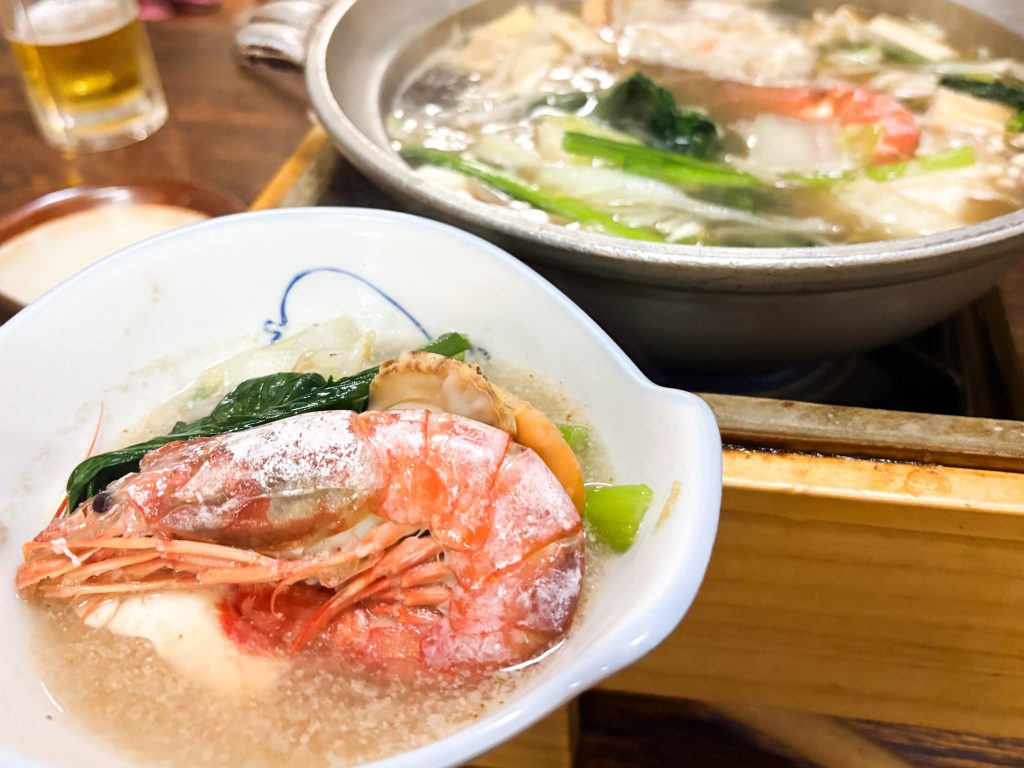 大きな有頭えび、鯛、いか、ほたて、あげ、豆腐、野菜が入っていました。