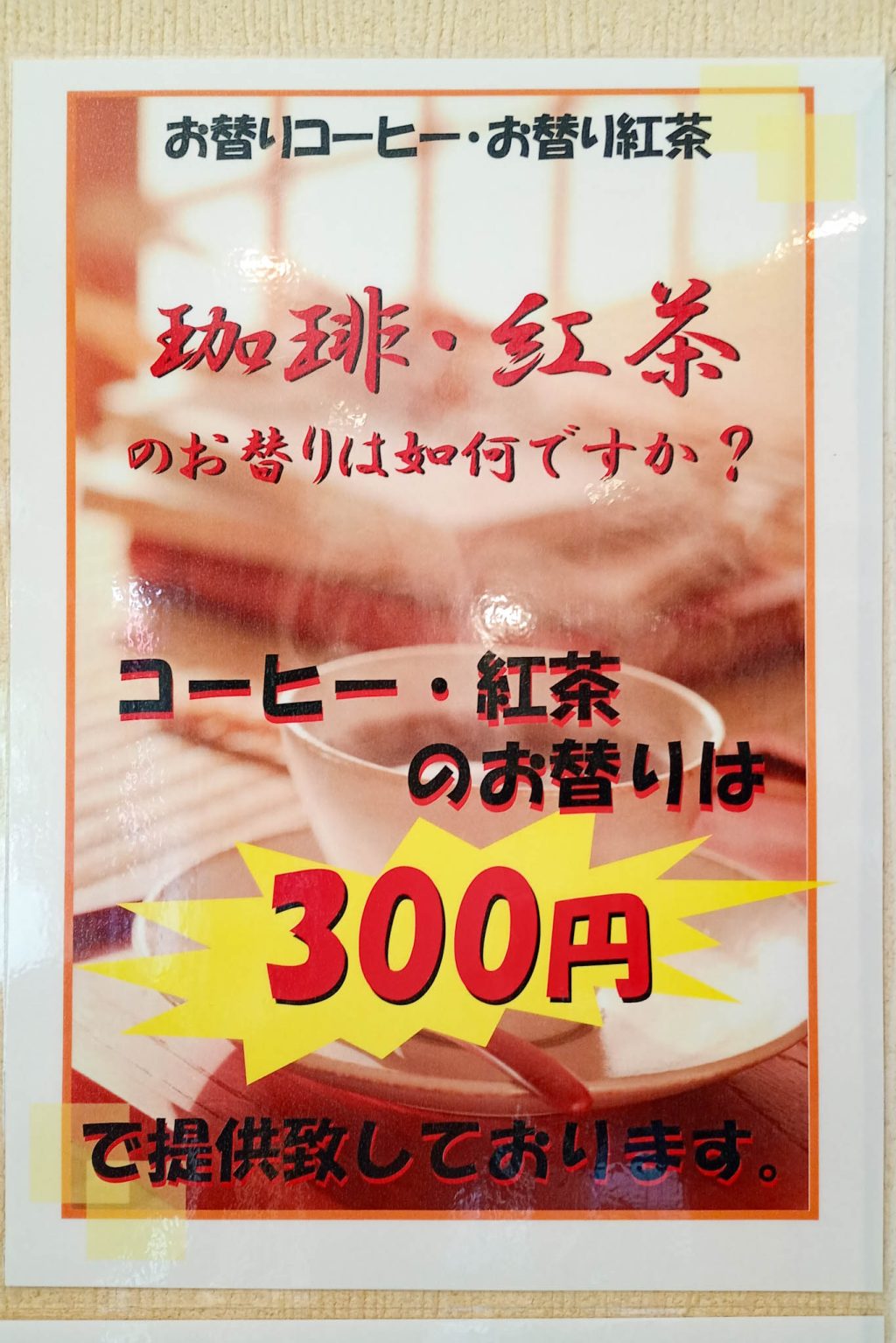 コーヒー・紅茶をもっと飲みたいな〜ってときは、300円でおかわりもできるようですよ。