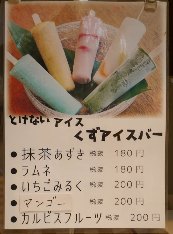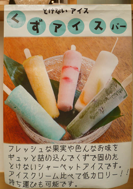 夏季限定商品の「しずく」(水のようなわらび餅)や「冷やしみたらし」を用意するなど、老舗の伝統を守りつつも、なかなか攻めています。今回は店頭に見本(レプリカ)も置かれていた「くずアイスバー」を取り上げてみることにしました。