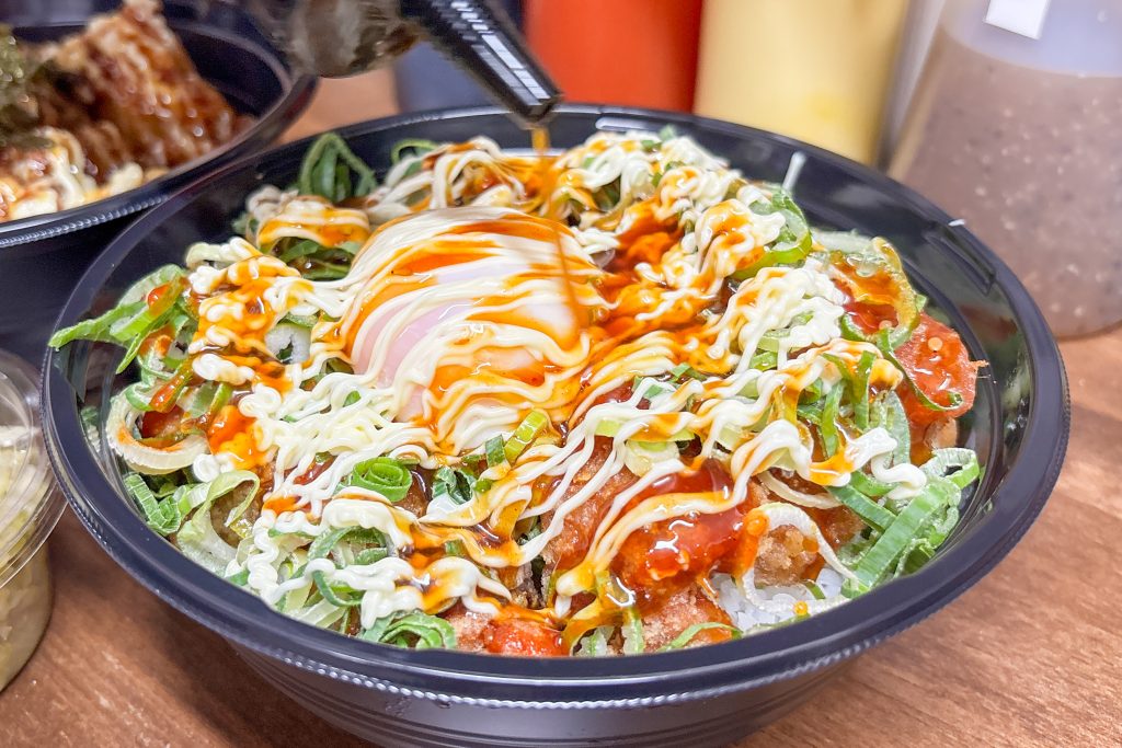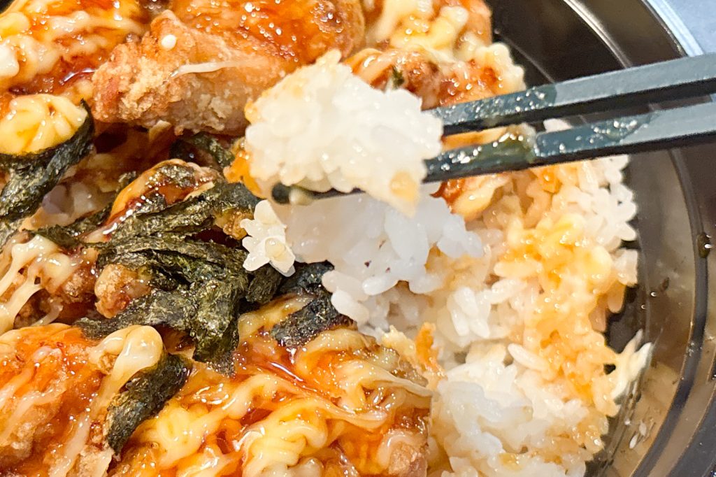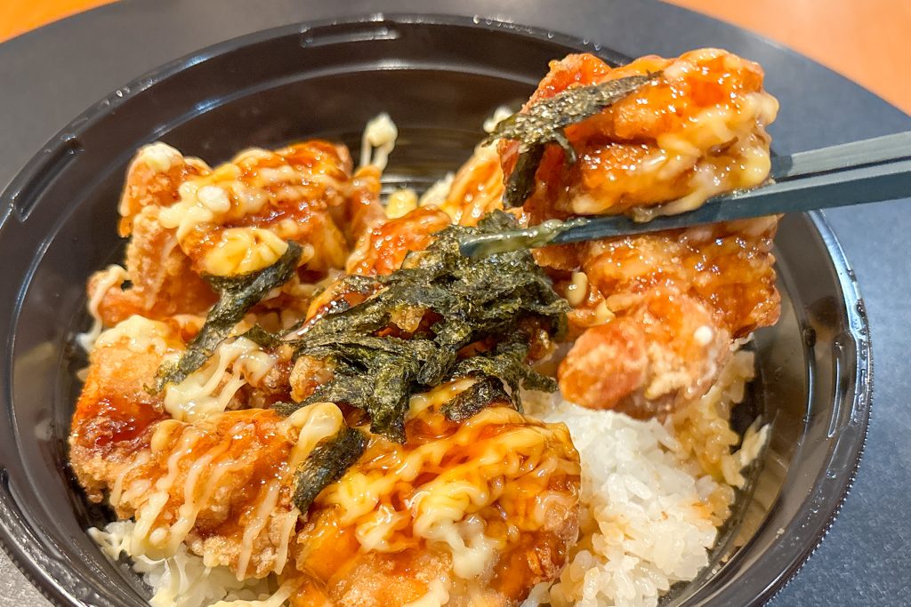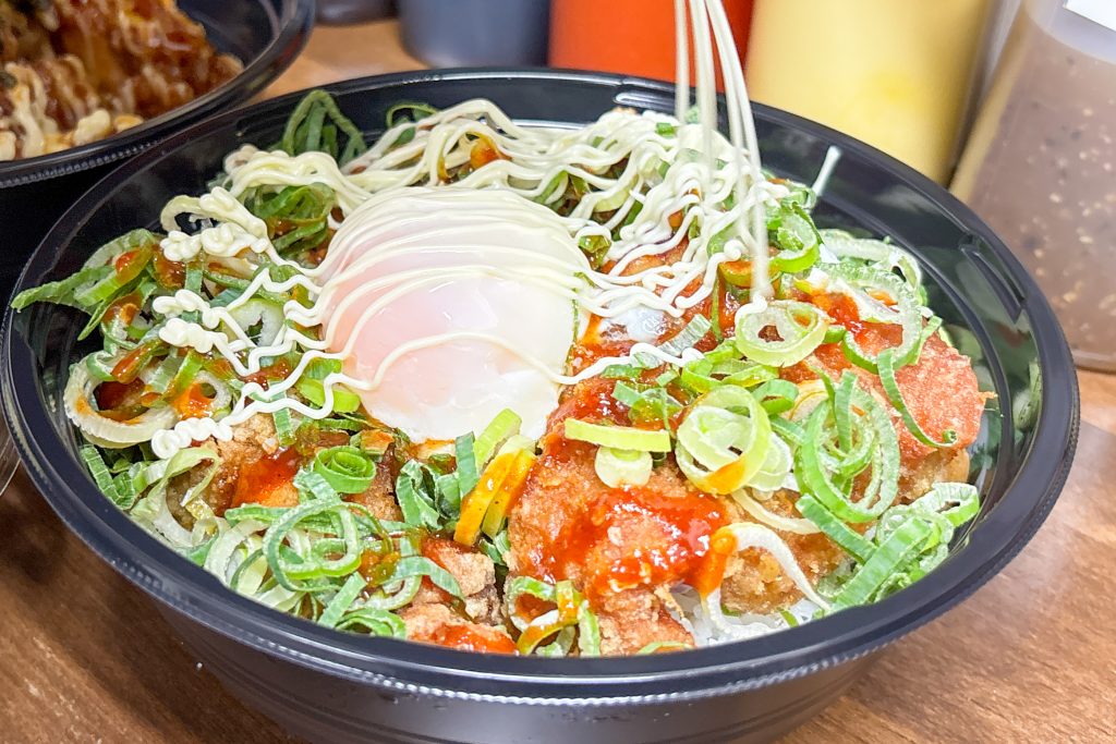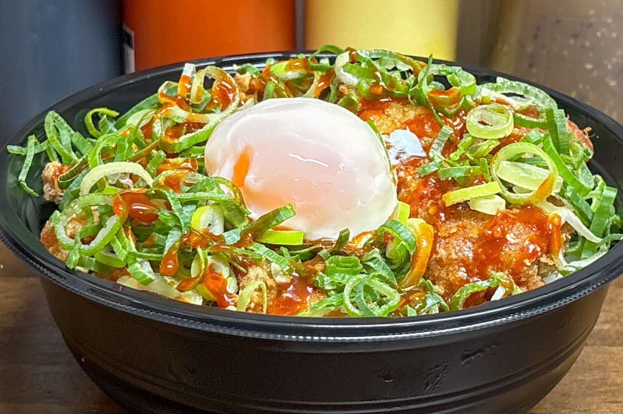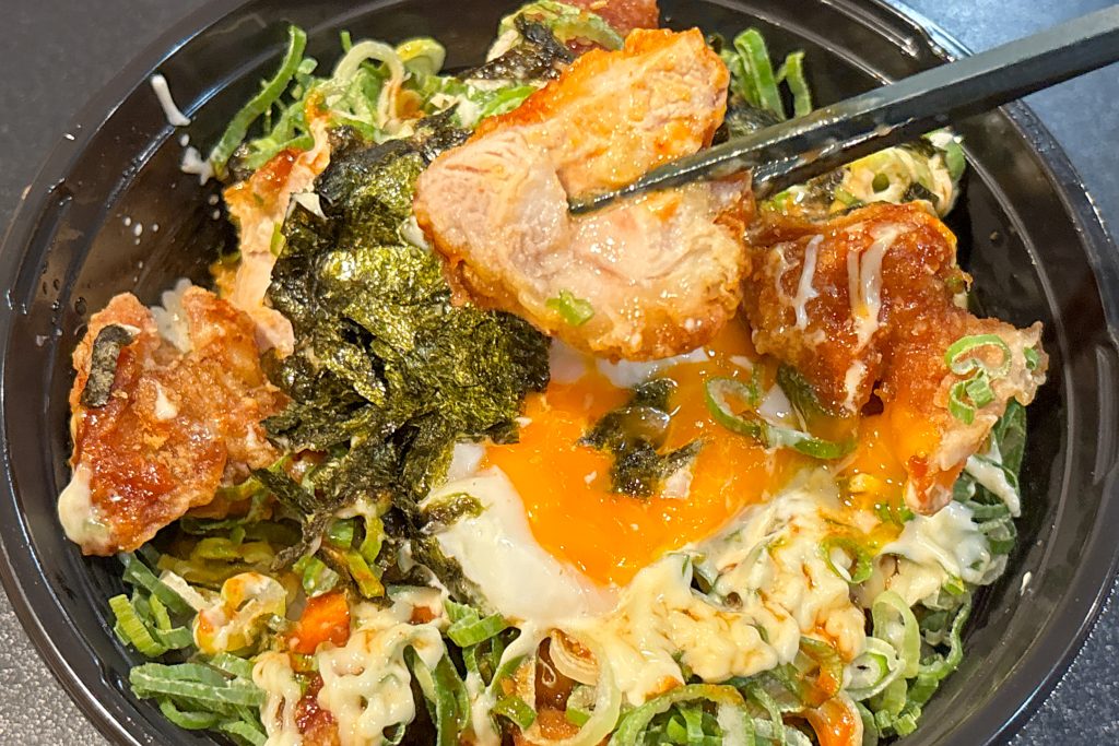 ねぎ玉からあげ丼は、ネギがシャキシャキでコチュジャンで少しピリ辛、なのにマヨネーズでまろやか~に。