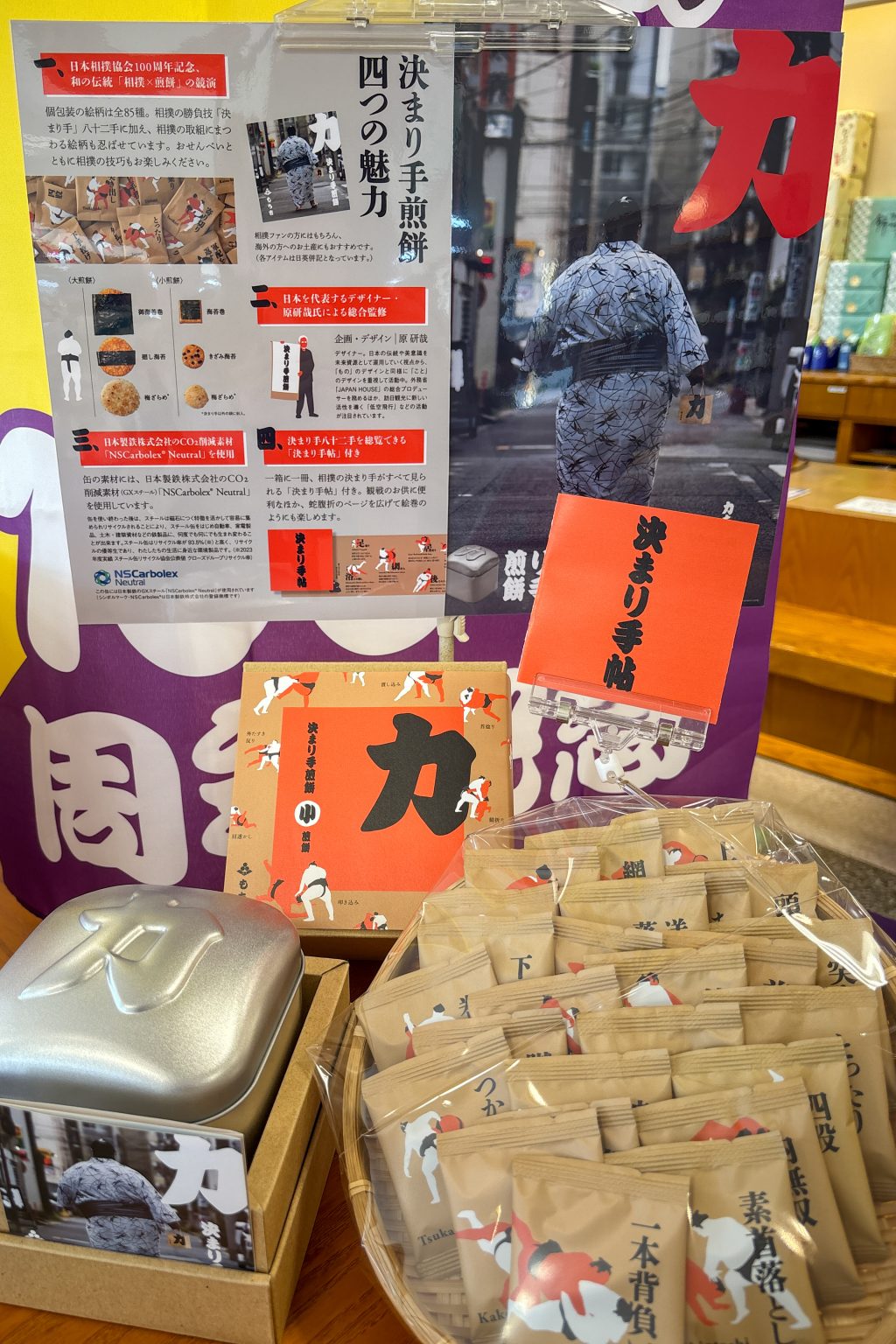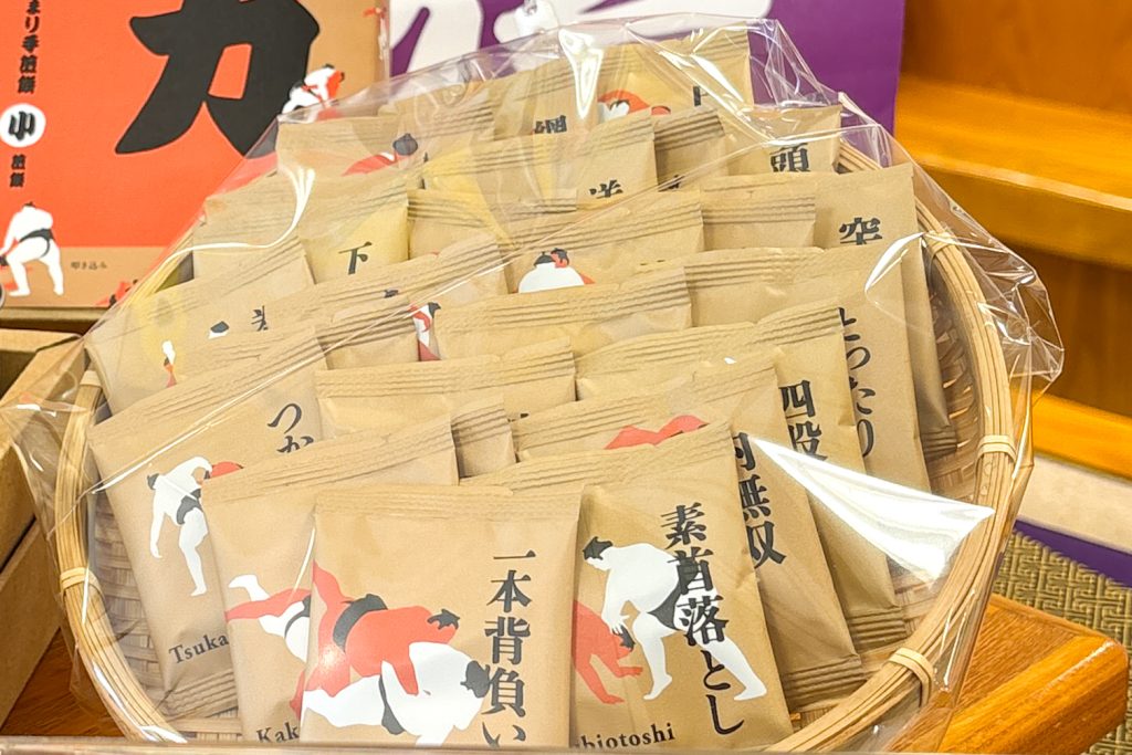 決まり手を描いた個包装の中におせんべいが。一枚一枚、絵柄と味が楽しめ、幸せ倍増!