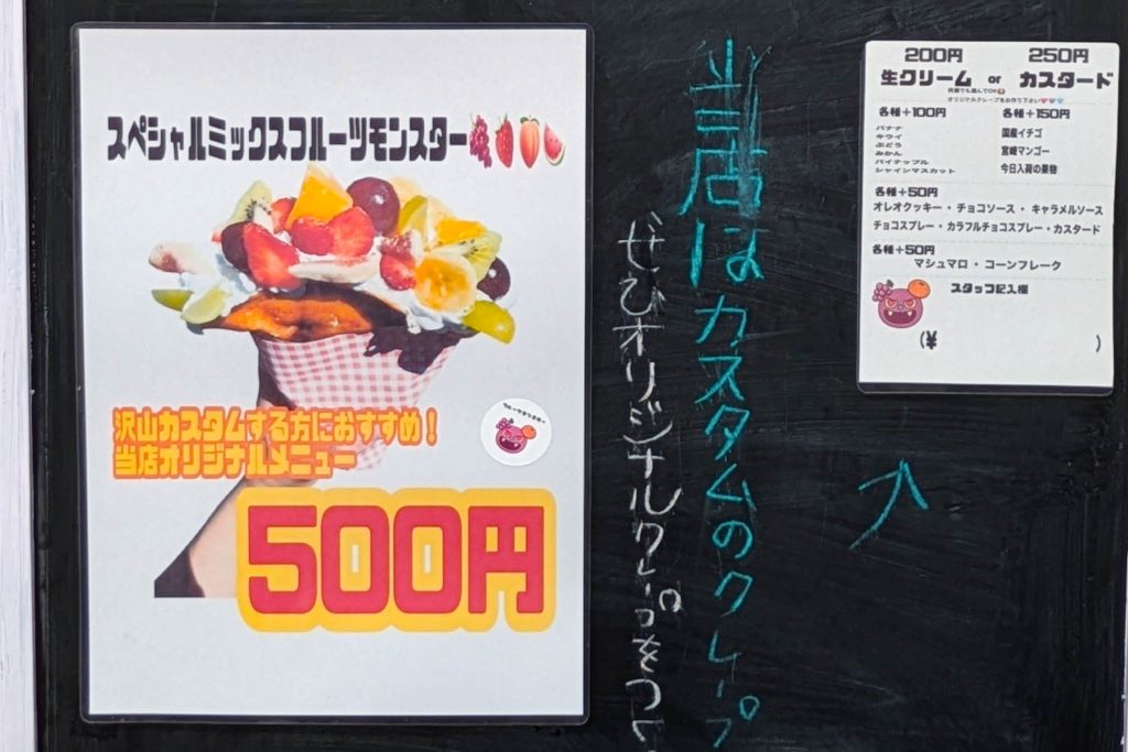 スペシャルミックスフルーツモンスタークレープ気になる…!クレープはカスタムできるそうです。