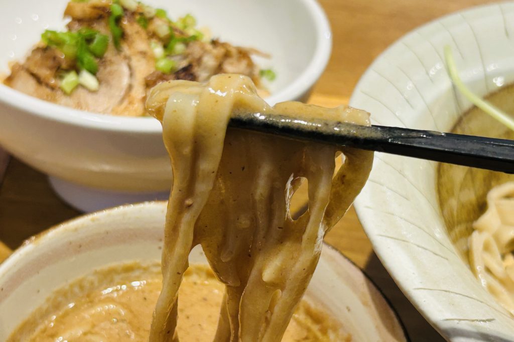 つけ汁に麺を浸し、ひきあげると、まるで麺をスープでコーティングしたような圧巻の絡み具合。