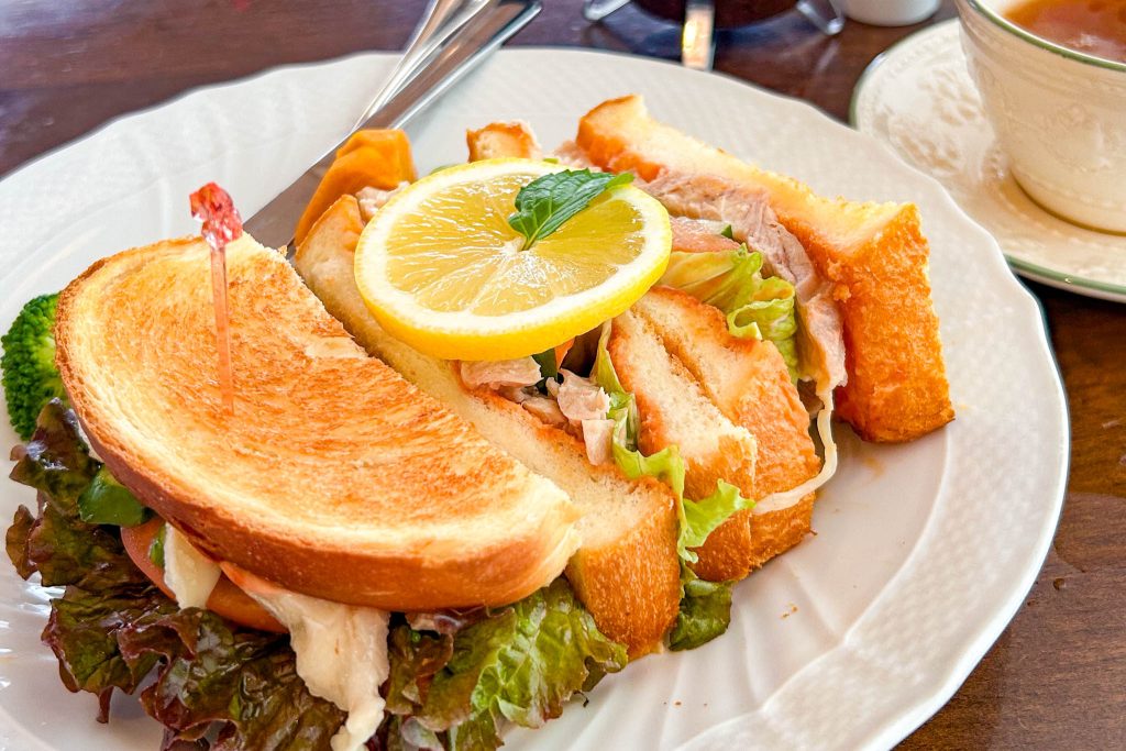 パシモンチキンサンドと、セットでセイロンティー(715円からセットで50円引き)をいただくことに。