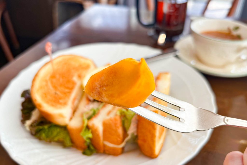柔らかしっとりパシモンチキンと、たっぷりお野菜、ほんのりケチャップを思わせるまろやかなソースが挟んであります。トーストとの相性抜群で幸せ。