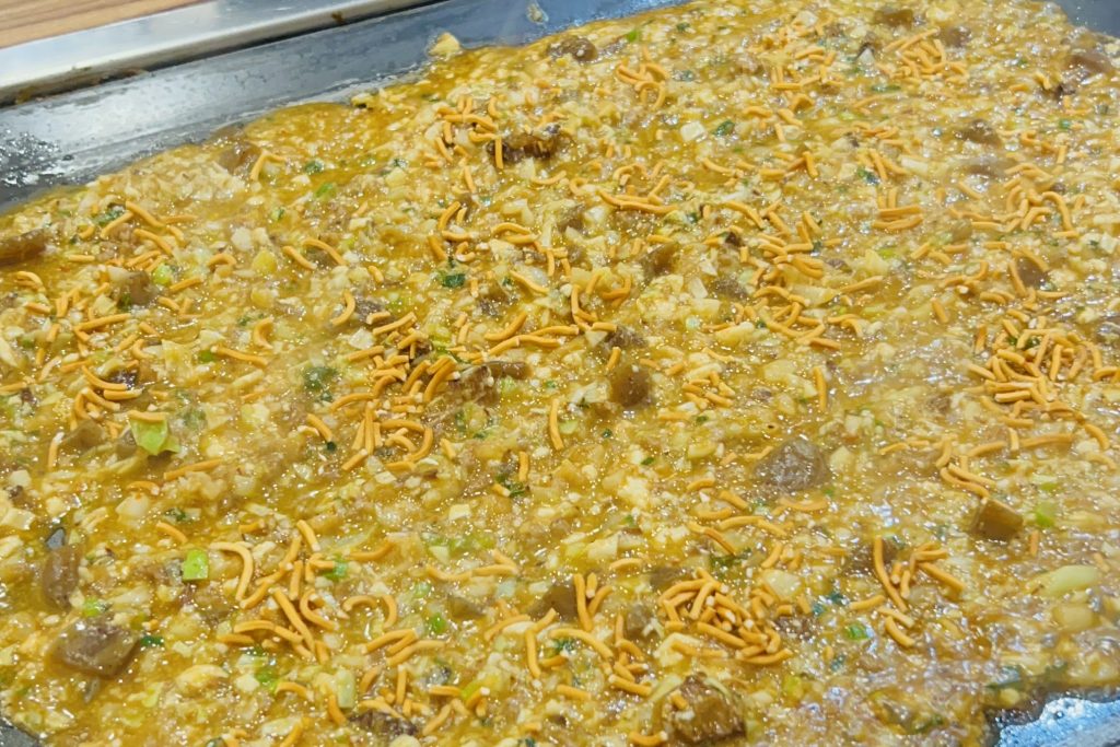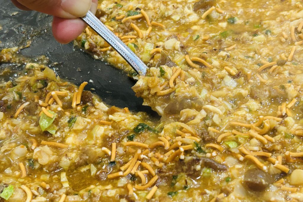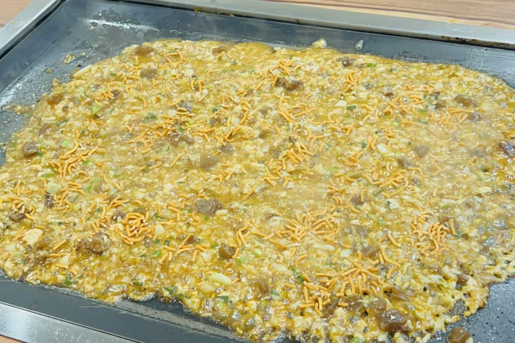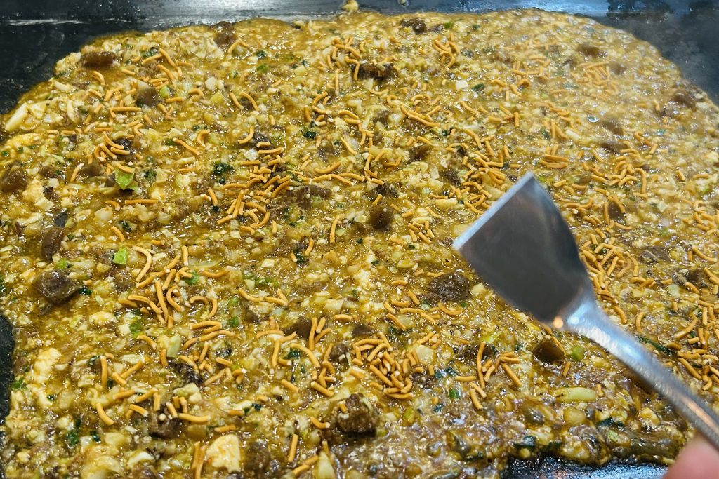 ヘラの向こうに広がる、もんじゃの海。どうやら完成の合図のようです。