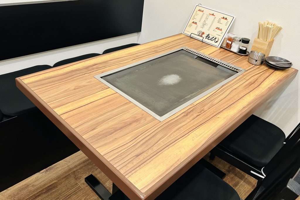 店内は、鉄板付きの4人掛けテーブル席が3卓と、2名まで座れるカウンター席を備えた、落ち着いた造り。