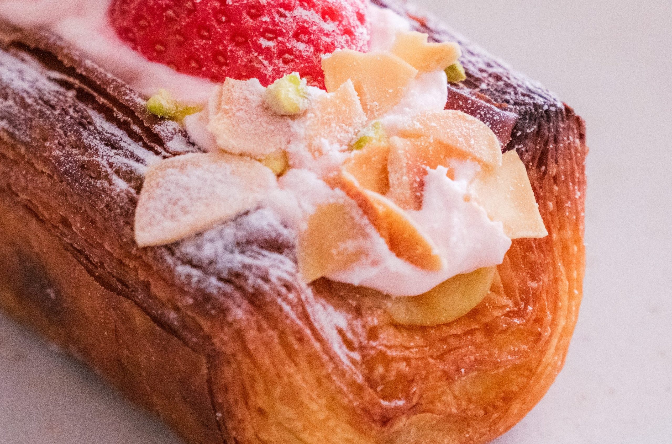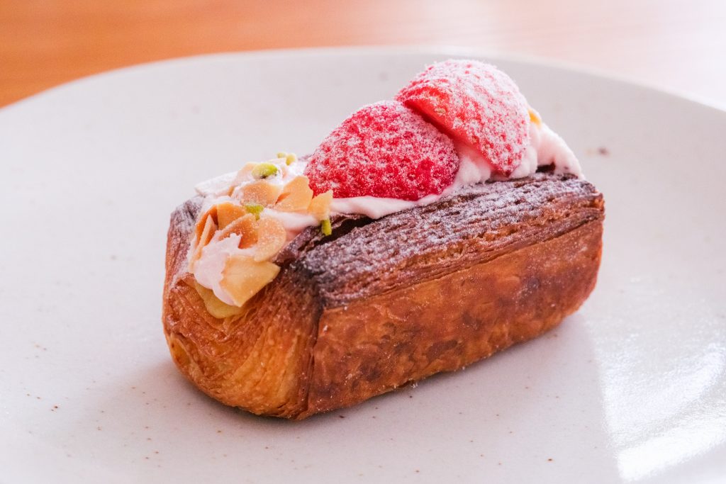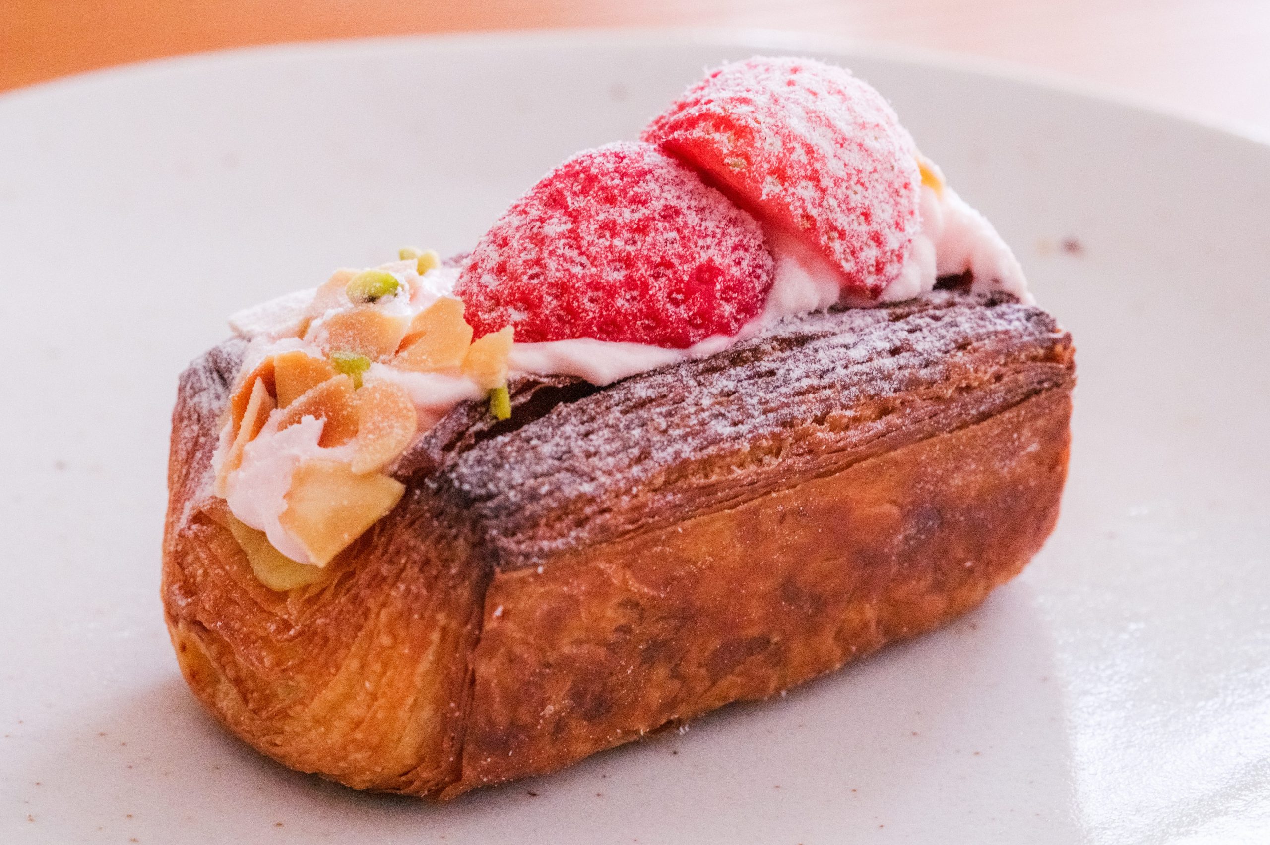 こんがりサックサクのデニッシュ生地にイチゴ味のソースとクリームがサンドされています。
