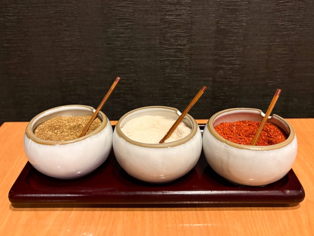 どの串も下味がついた状態で提供されますが、各席に山椒・塩・一味が置いてあり好みの味に調整できます。