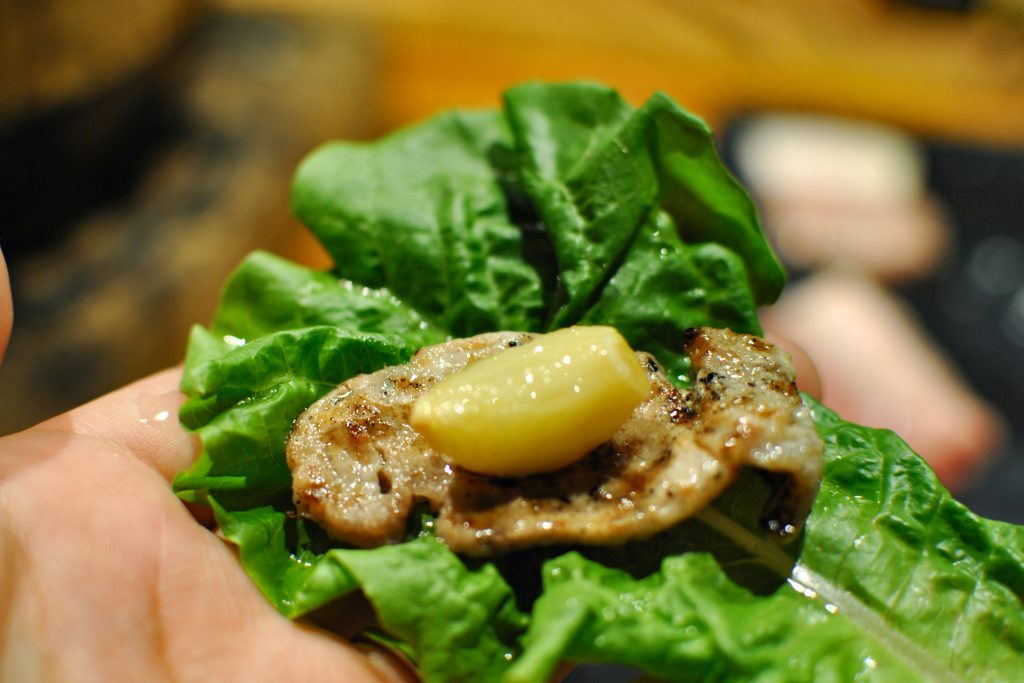 にんにく(450円)とサンチュ(400円)も注文して、焼いたお肉を巻いて食べてみたり。