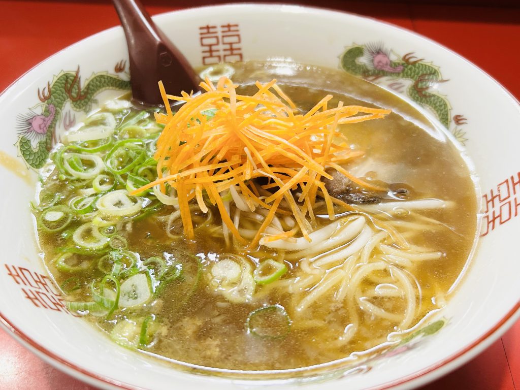 醤油ベースのスープにねぎと細切り野菜が映えて、昔ながらの一杯らしい素朴な顔立ち。