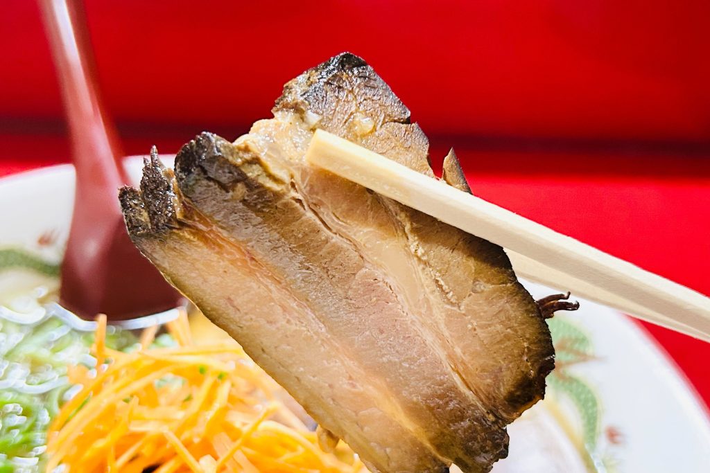 ぶ厚めに切られたチャーシューは、噛むほどにスモーキーな風味が広がる一枚。