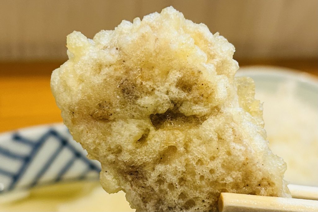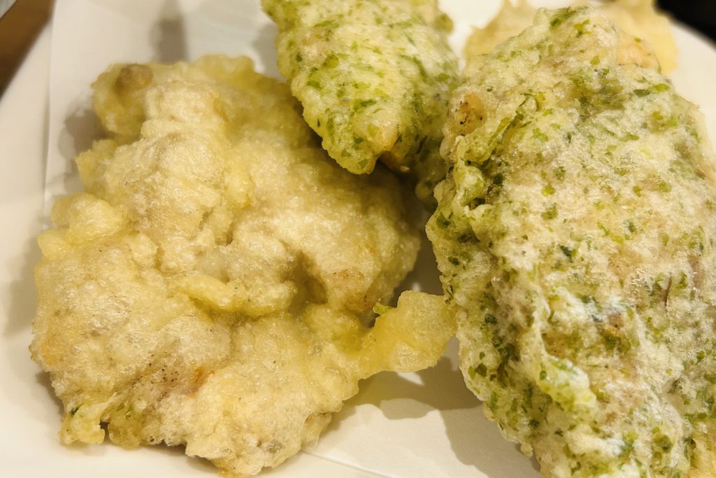 塩コショウのかしわ天はキレのある味わいで、衣のサクッと感と鶏のジューシーさが真っ直ぐ刺さる一品。