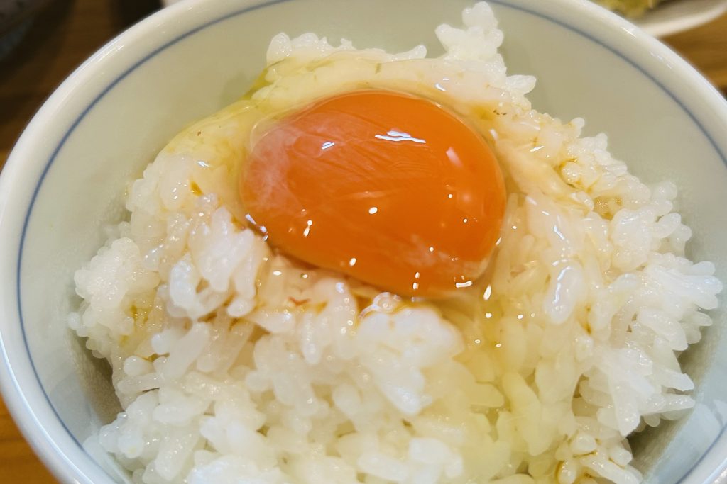 まずは王道のたまごかけご飯。殻を割ると黄身がゆっくりとろりと落ちて、ご飯の上で輝きます。