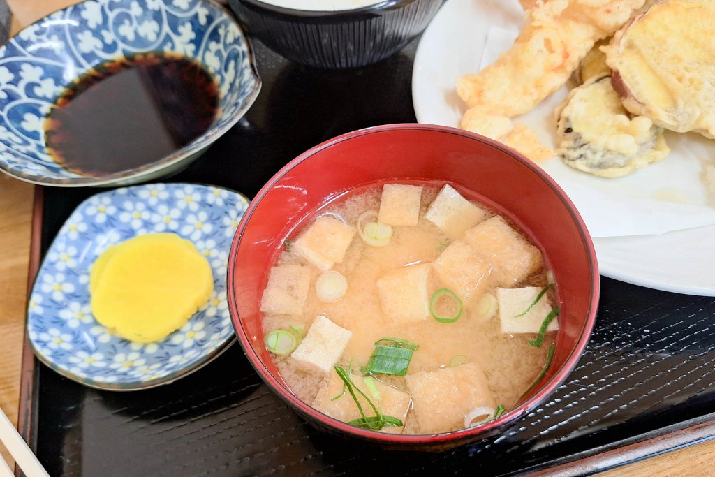 豆腐、あげ、ねぎ入りでほっこりするおいしさ♪たくあんのお皿かわいい~