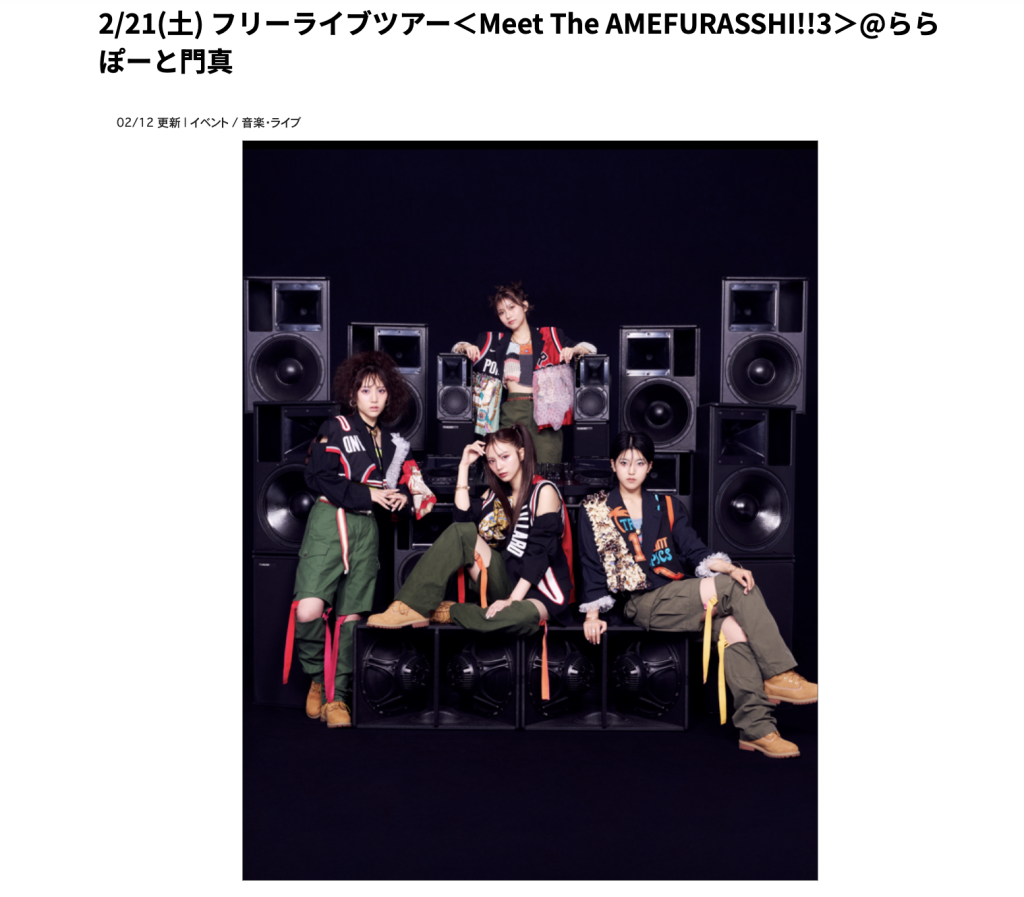 ららぽーと門真で「フリーライブツアー<Meet The AMEFURASSHI!!3>」が開催されるようです。