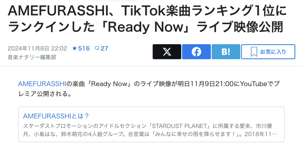「AMEFURASSHI」は、スターダストプロモーション所属の4人組ガールズ・グループ(→公式サイト)。お知らせによると、3月13日のラストライブをもって、解散が決まっているようです。