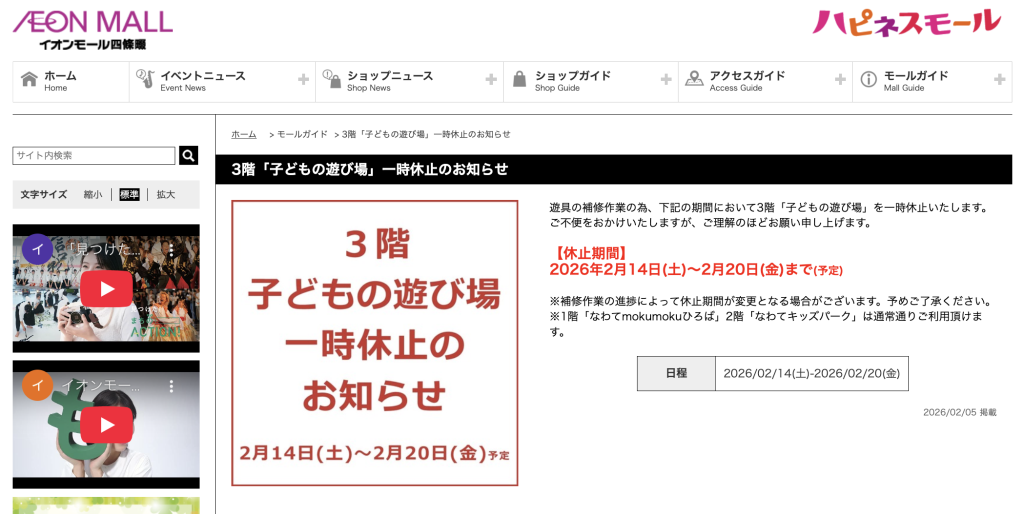イオンモール四條畷の「子どもの遊び場」が一時休止するようです。