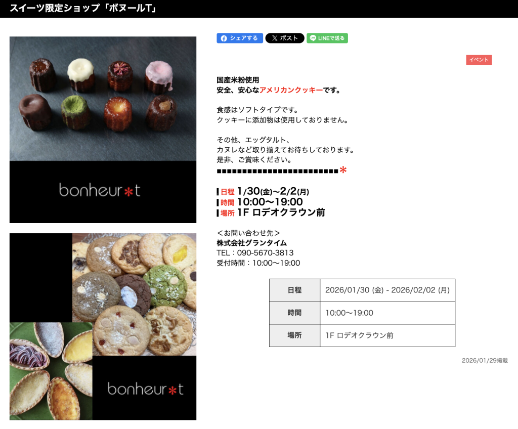 出店期間は1月30日~2月2日の10:00~19:00。場所は、1F ロデオクラウン前です。