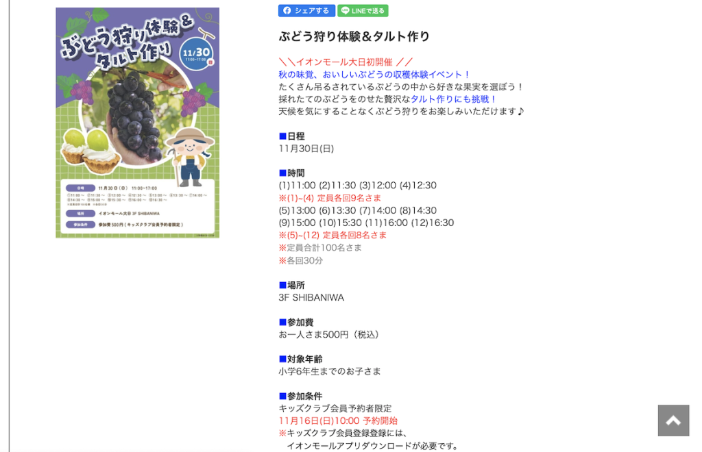 対象はキッズクラブ会員の小学6年生までのお子さんで、11月16日の10時〜予約開始とのこと。お天気を気にせず楽しめますし、イオンモールでのぶどう狩りはなかなかできない体験なのでは。気になる方はぜひ〜!