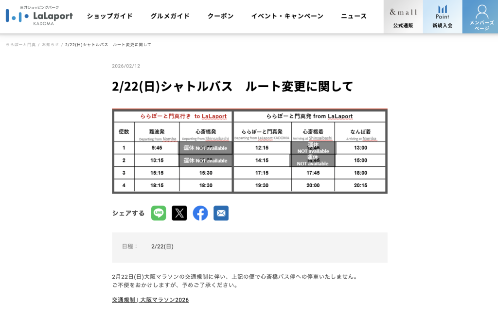 公式サイトによると、2月22日(日)は大阪マラソン2026の交通規制に伴い、特定の便で心斎橋バス停への停車をしないとのこと。