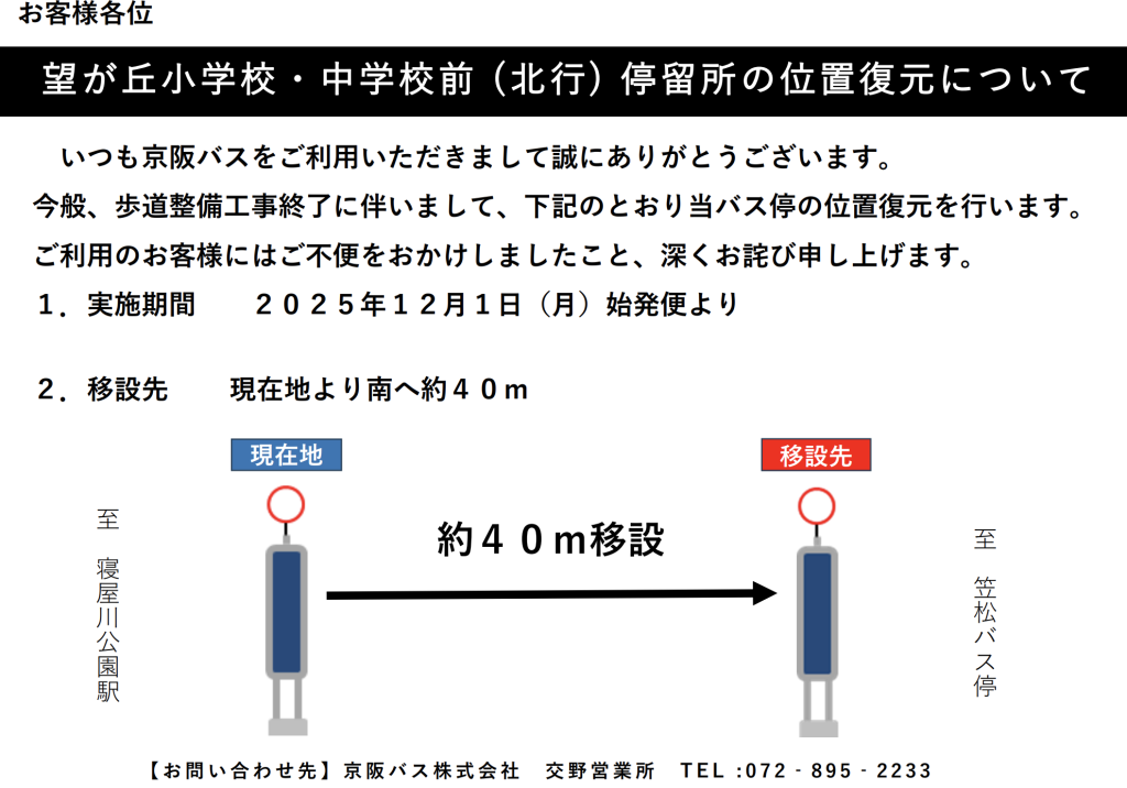 公式サイトによると、歩道整備工事終了に伴い、京阪バス「望が丘小学校・中学校前(北行)」停留所の位置が復元され、現在地より南へ約40m移設されるとのこと。